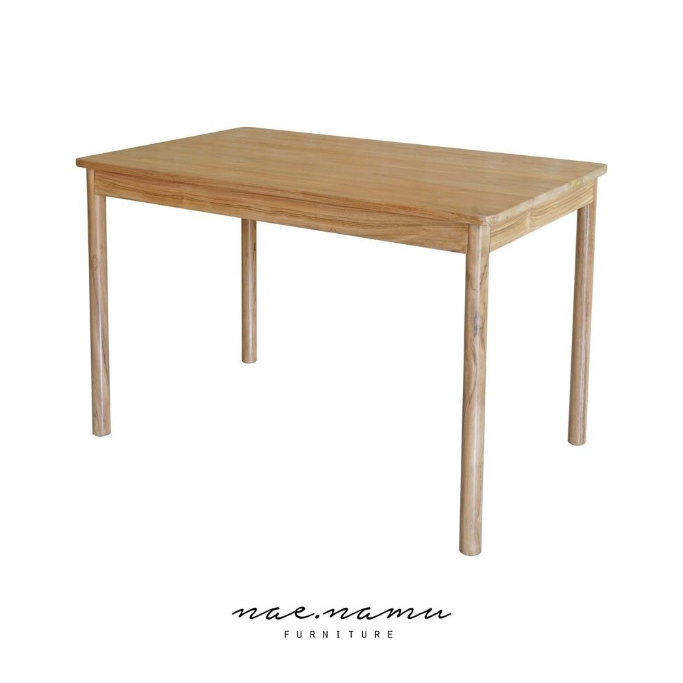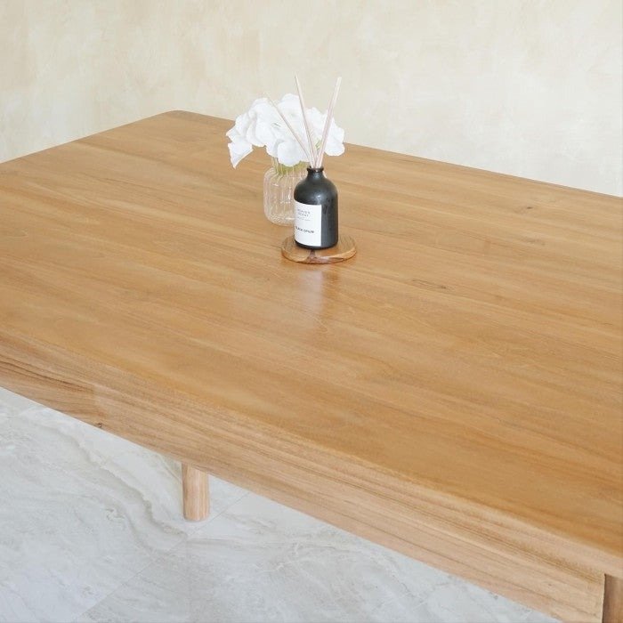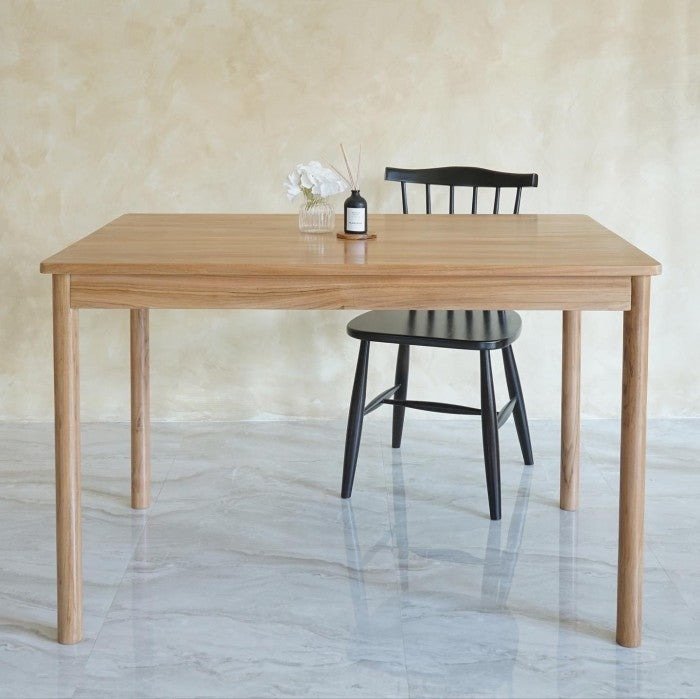 | Naru Dining Table, desainnya yang minimalis tampak pada kaki meja yang lurus, sehingga memiliki keunggulan pada efisiensi ruang. Sudut-sudutnya yang rounded juga menambah kesan manis pada meja makan ini.