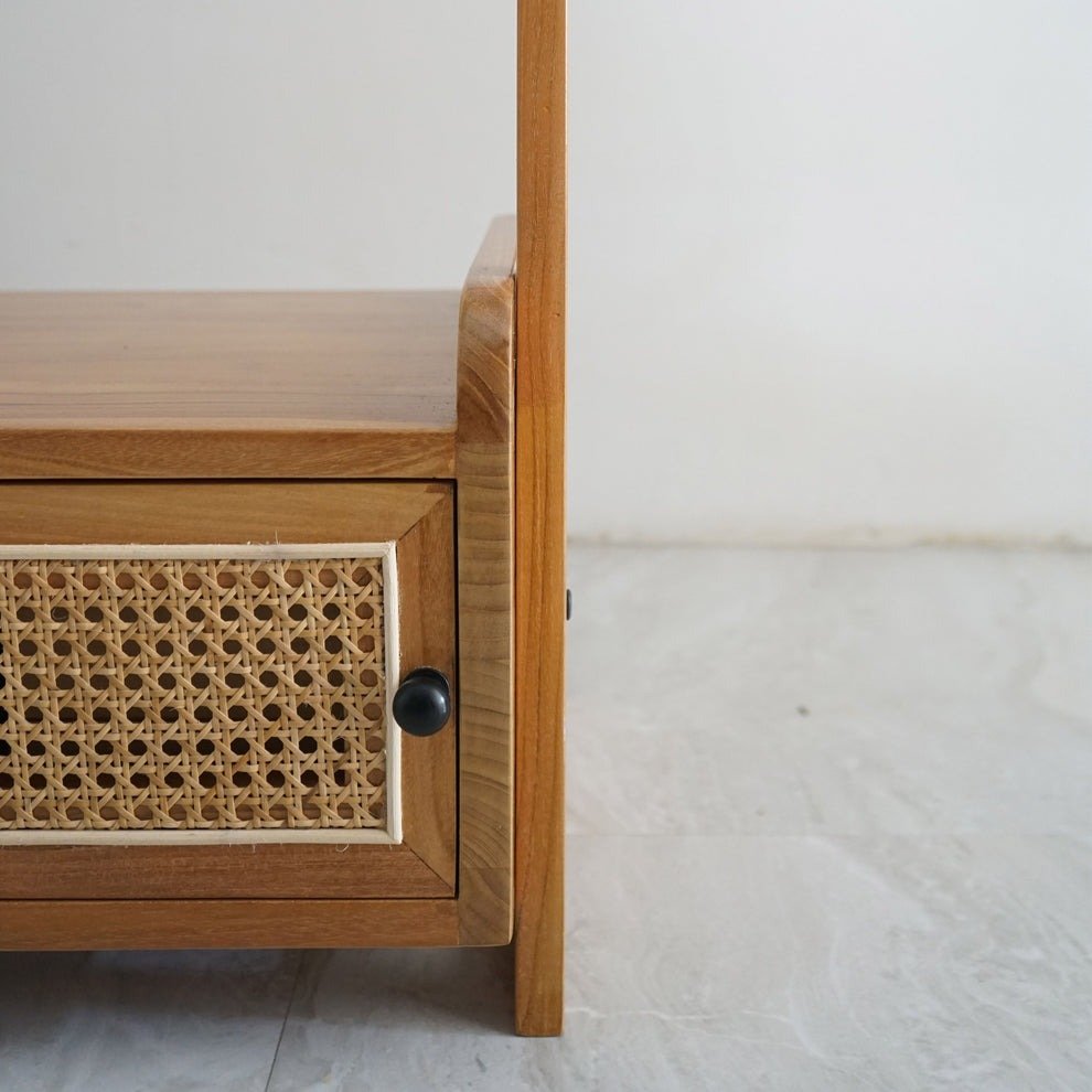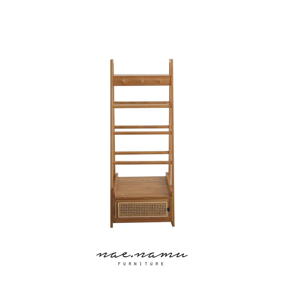 Di bagian bawah rak, terdapat tempat penyimpanan yang dilengkapi dengan pintu rotan. Pintu rotan memberikan sentuhan estetika yang menawan sambil menyembunyikan perlengkapan lainnya dengan rapi. Dengan desain yang proporsional, rak ini tidak hanya menyediakan ruang penyimpanan yang cukup, tetapi juga memberikan tampilan yang harmonis.