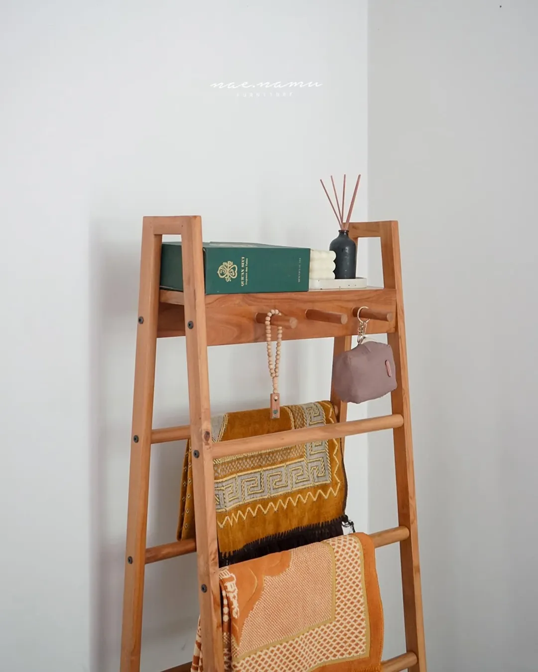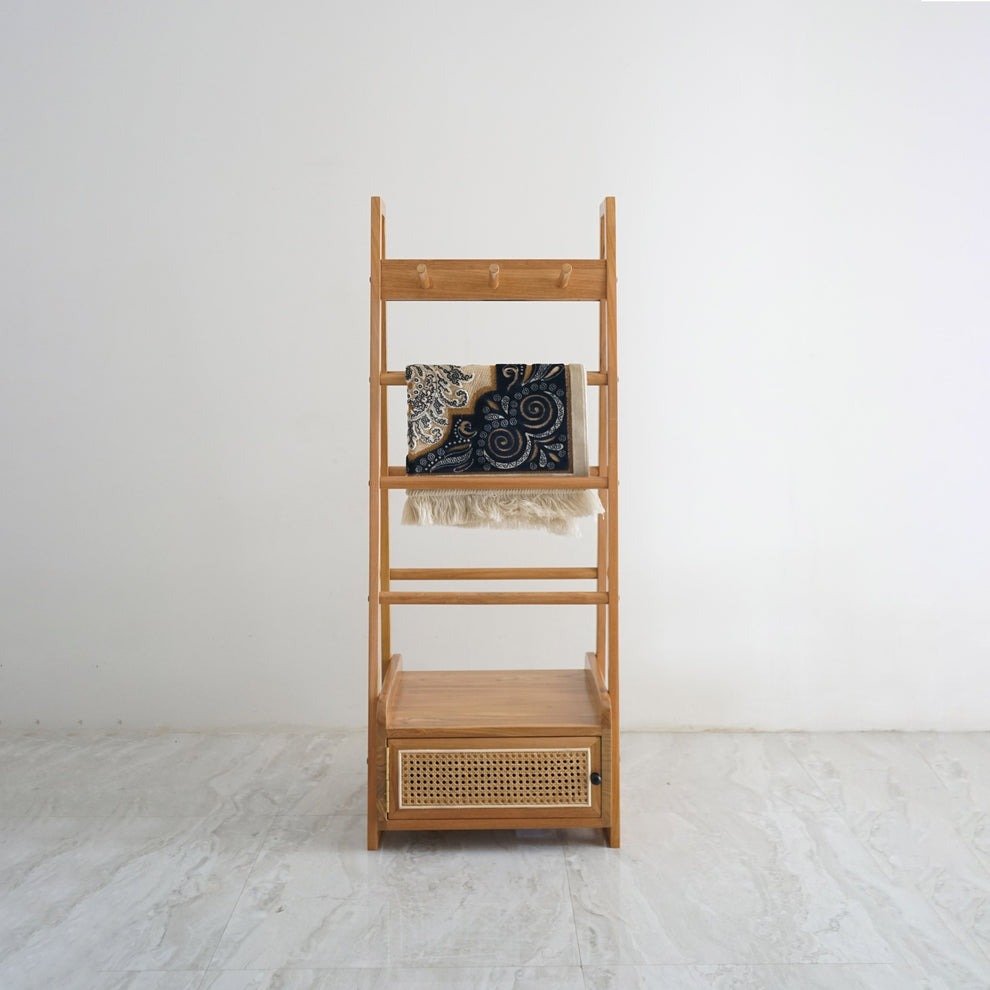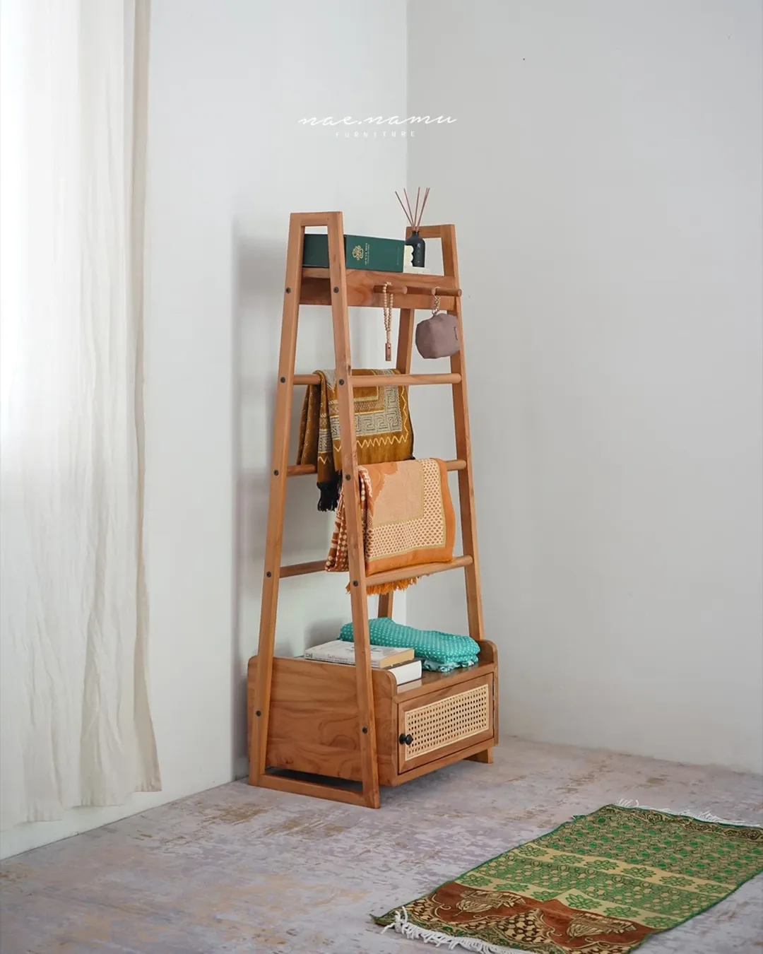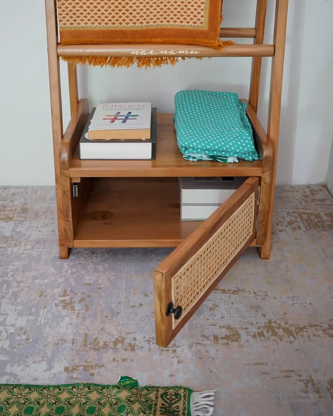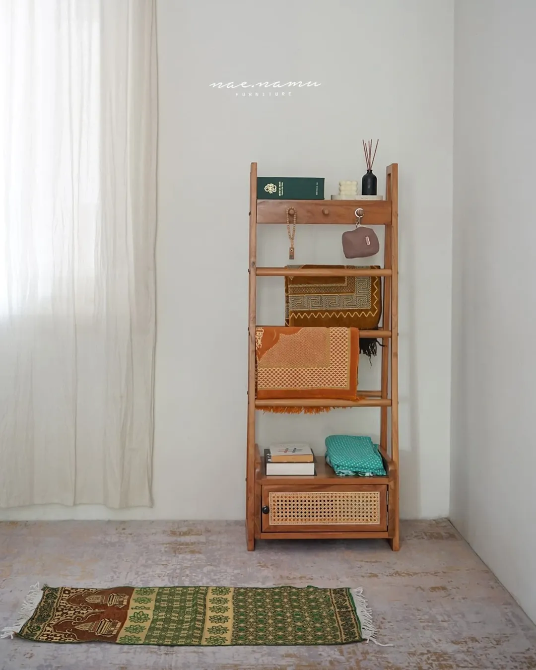 Rak ini memiliki bagian atas yang diatur secara khusus untuk menyimpan mukena dan sajadah dengan rapi. Dibuat dengan kayu berkualitas tinggi, rak ini memberikan tampilan alami dan hangat yang cocok untuk berbagai dekorasi ruangan.