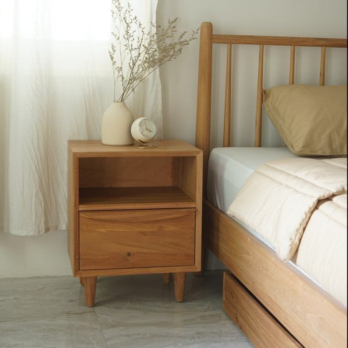 | Dengan desain yang masih satu tema dengan Siena Bed, meja nakas ini tampak manis mendampingi Siena Bed atau bahkan dipan kasur minimalis lainnya. Walapun berukuran kecil, meja memiliki beberapa fungsi seperti menyimpan barang-barang kecil seperti buku, lampu, atau ponsel. Siena Bedside Table memiliki ruang penyimpanan tertutup dan terbuka, sehingga Anda bisa mengatur barang mana yang perlu disimpan di dalam maupun diletakkan di luar sehingga menjadi tambahan dekorasi pada ruang tidur Anda.